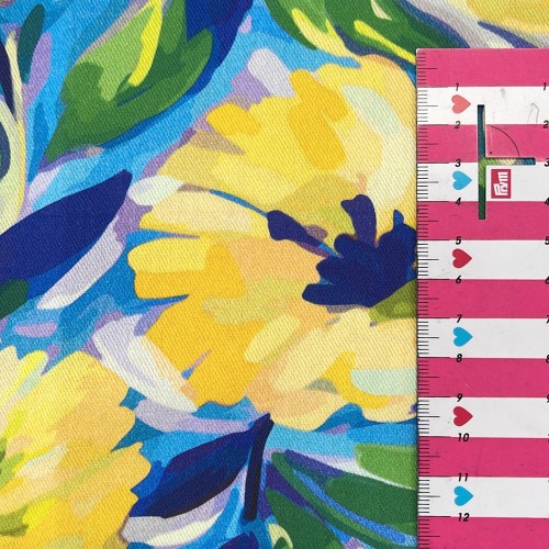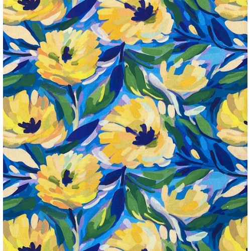 PEONIE ACQUARELLATE GIALLE BASE TURCHESE VERDONE E BLU drill mezzo panama